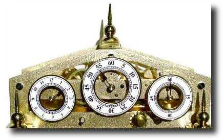 The power supplied via a large fusee; the timekeeping governed by a steel ball rolling on a grooved table, releasing a latch at the end of its travel, allowing the train to advance while the table tilts toward the opposite end and the ball re-traces its original path in the other direction. The time is indicated on three elevated dials, minutes in the center, hours to the left and seconds to the right. With a sturdy plexi-glass cover and a polished black marble base; very high quality throughout. Height of clock 14", with cover and base 17".