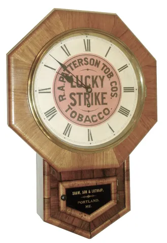 New Haven Clock Co., LUCKY STRIKE advertising clock, 8 days, spring, time only, with gold leaf tablet for ?Shaw, Son & Lothrop, Portland, ME? c1900