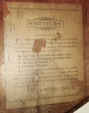 the R. A. Patterson Tobacco Co., was a a Virginian company, originating around 1875, They contracted for many different tins, plaques and wall clocks ...
