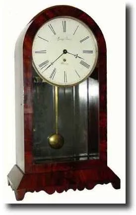 C.1840, English, Fusee Mantel clock Timepiece in a mahogany case and in very good condition. A break in the pendulum has been repaired with solder. Retains original hands and painted dial with the signature George Berry, (strengthened at some point), and below the winding arbor, "Whitby" still original. The well figured mahogany veneer is still in good condition, and the case retains original mirror in the back of the case. Ticks robustly. Height 26"