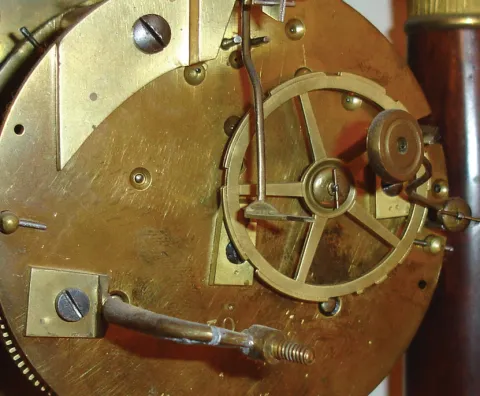 Mahogany veneered case in overall very nice condition with a small damaged area on the back of the base. Brass dial has a little wear to some of the n...