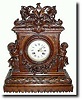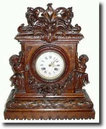 C.1880, Black Forest Carved mantel clock with a good French bell strike movement. The dark oak case depicting Jack and Jill in the woods, holding a garland that supports the clock, the case surmounted with further carved vines. Some of the tips and flowers are broken away, however it is still very nice and can be restored. The porcelain dial is good except for a chip at the left winding hole. The movement is signed L. Marti and Fils (Medaille de Bronze), Height 17"