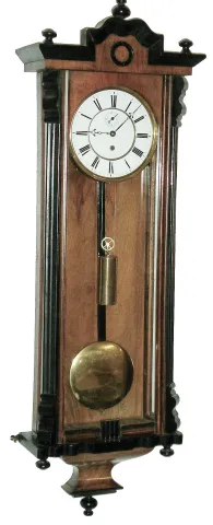 Lenzkirch, Germany, Vienna Regulator wall clock, 8 days, time only, weight driven movement marked with old Lenzkirch hallmark in a mahogany and ebonized case with a white enamel dial and subsidiary seconds, serial number 187093, c1870