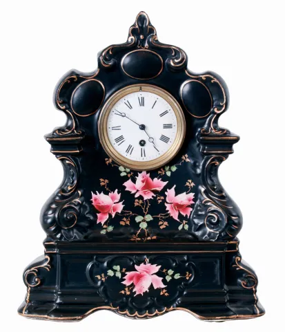 Black porcelain case with painted flower decoration is very nice with some minor wear to the applied gilding. Original porcelain dial is perfect. Orig...