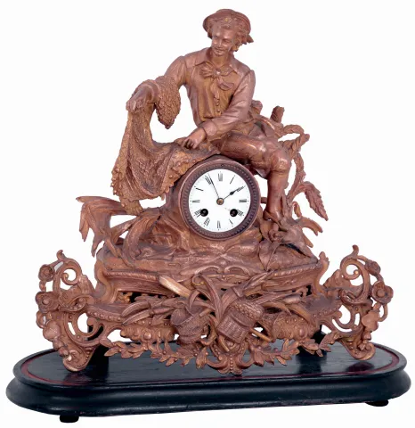 French cast fisherman spelter figural, 8 days, time and strike, mantel clock on painted wood base (no glass dome), unsigned movement, c1880