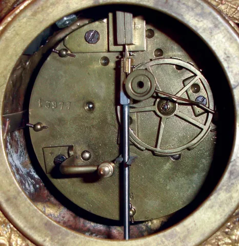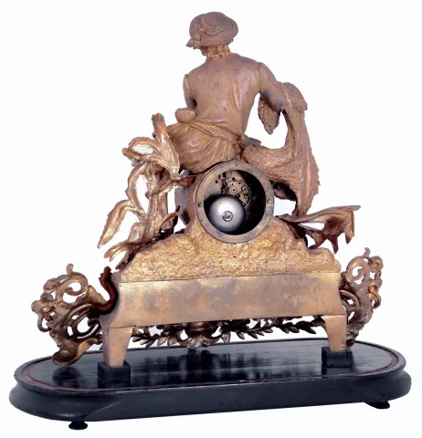 the large ornate case appears to retain its original gilt finish, with some wear and one repair to a side piece. The base black paint also is worn. Th...
