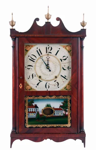 Seth Thomas Clock Co., Plymouth Hollow, Conn., 30 hours, time and strike, weight driven wood movement pillar & scroll shelf clock with alterations, c1830