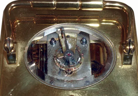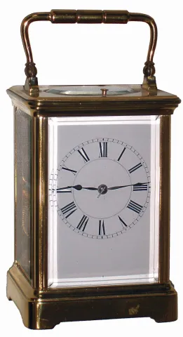 French, 8 days, time, strike and repeat brass and beveled glass carriage clock, c1900