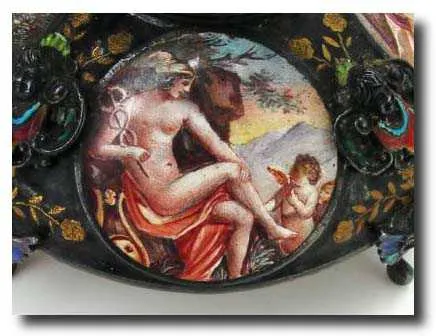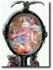 reflecting the enamel over copper work of country artisans during the reign of Ferdinand I. This and the next lot are truly exceptional pieces in terms of "lots going on". A reversed cup base is decorated with 4 miniature scenes, each separated by a cherub with a blue and red bib. Then a large round drum supports a miniature elephant with 2 monkeys on his back plus the clock itself, surmounted by an eagle. The movement is an early verge/ chain fusee from a watch. These miniatures were meant as a keepsake, and often utilized whatever type movement the artisan could come up with. Height 7" (18cm)
