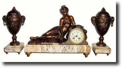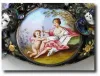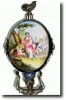 reflecting the enamel over copper work of country artisans during the reign of Ferdinand I. In this model a genie type figure in Turkish dress, supports the clock on his head, the clock itself surmounted by a colorful rooster. The bottom 4 cameos of a mother playing with cupid, and a rear scene of mother with her son on one side and cupid on the other. This movement is signed J. Leroy. Height 8" (22cm)