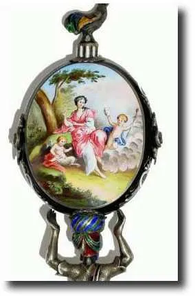 C.1845, Austrian, Miniature Desk Clock reflecting the enamel over copper work of country artisans during the reign of Ferdinand I. In this model a genie type figure in Turkish dress, supports the clock on his head, the clock itself surmounted by a colorful rooster. The bottom 4 cameos of a mother playing with cupid, and a rear scene of mother with her son on one side and cupid on the other. This movement is signed J. Leroy. Height 8" (22cm)