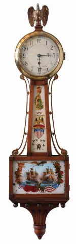 Chelsea Clock Co., Boston, Mass., 8 days, spring driven brass movement with balance wheel, 3/4 size banjo wall timepiece, serial #523484, c1947