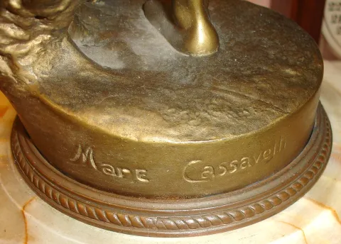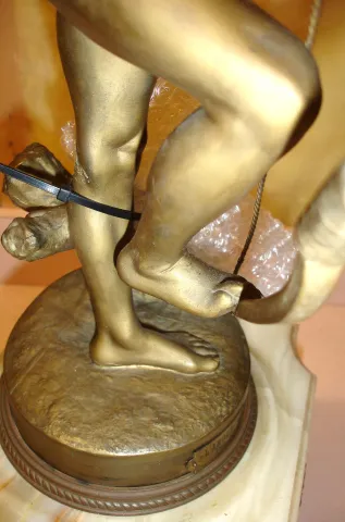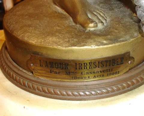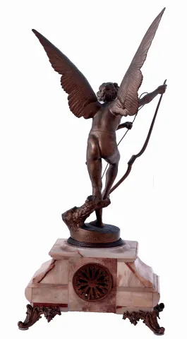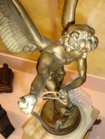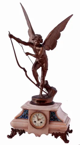 French figural mantel clock, cast spelter winged figure signed Mare Cassavetti on onyx and cast brass base with enameled plates, 8 days, time and strike, unsigned movement with count wheel and bell striking, c1890