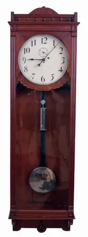 Large American Jeweler's Regulator wall clock, 8 days, time only, weight driven with a Seth Thomas No. 62 movement with a meter long pendulum in a cherry case with nickel bob, weight and clamshell pulley and painted metal dial, c1900