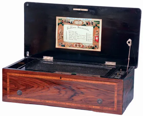 M.J. Paillard, New York, importer of Swiss "Sublime Harmonie" inlaid rosewood double-comb 6 tune music box, c1880