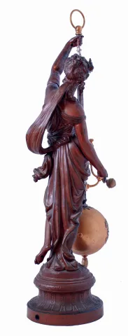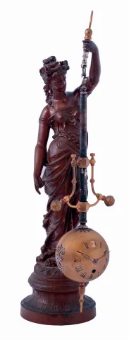 the figure has had her upraised arm reattached, but the rest appears intact with some minor losses of patination. The swinging ball has an old-looking...