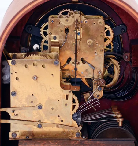 Seth Thomas Clock Co., Thomaston, Conn., Sonora Chime, inlaid mahogany mantel clock with 8 days, 8 bell quarter-chiming movement, c1915