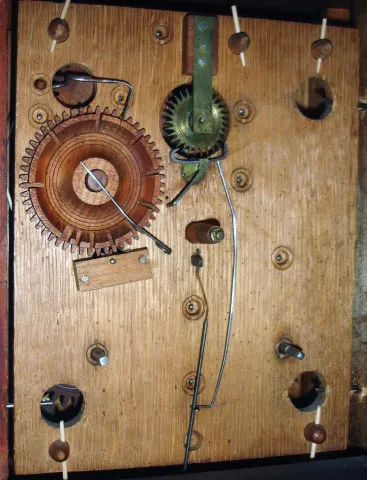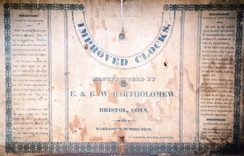 E. & G.W. Bartholomew, Bristol, Conn., 30 hour, time and strike weight wood movement hollow column shelf clock.