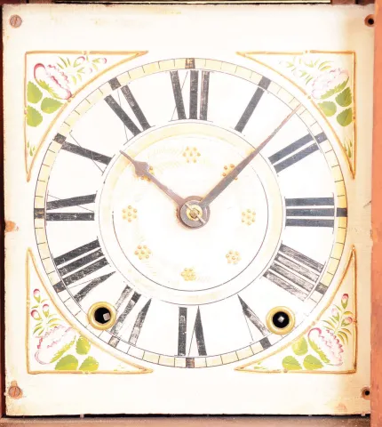 Mahogany veneered case in an old and possibly original finish in very nice condition. Original painted dial is pretty clean with some wear to the chap...