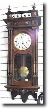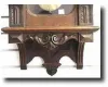 Brass eight day movement that chimes on the quarter hour on four rods. It also strikes the hours after chiming on four other rods. Thus, it has 8 rods altogether. The movement is held in place by two special lock screws, so it is securely fastened. Carved case with double full columns decorating each side of the door. The top headpiece is also original, and has a nice balcony on it. The Arabic numeral silver dial has some tarnishing on it, but it is original. In excellent running condition.