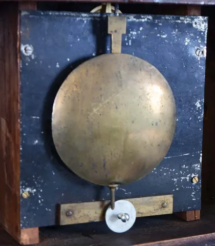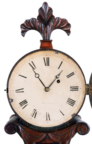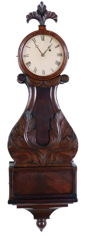 (Attributed to) Abel Stowell, Charlestown, MA, 8 day brass movement lyre banjo timepiece. The clock may have been made by Stowell as another with nearly identical carving has recently been sold at auction. Another example with a similar carved front by L.