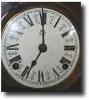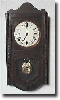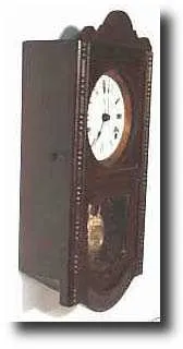 Box wall regulator, c. 1900 Measuring 18 by 8 inches, this clock has a replaced 5 inch diameter porcelain dial with red designs between the numerals. The decoration on the headpiece is lacking and has been for some time, but beading work decorates the door. The engraved brass pendulum is visible through the shaped glass in the bottom. Inside is an eight day movement that strikes on the hour.
