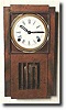 measures 15 by 8 inches, and has a 4 inch porcelain dial with blue numerals. Eight day movement, strikes on the hour. Case has a small crack in the wood that covers the glass in the bottom, but that's really this clock's only flaw. It does run and strike.