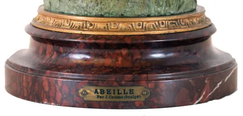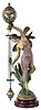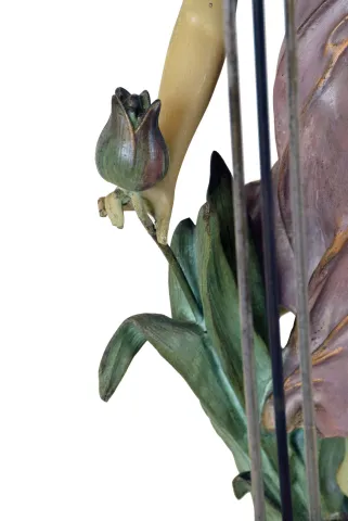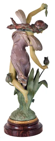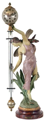 French swinger mystery clock, polychrome "Abeille", after sculptor J. Causse, with female fairy figure parading through tulips, supporting the extra long 28.5" clock and compound pendulum arm, spherical case with foliate and pineapple applique and dragon