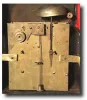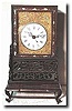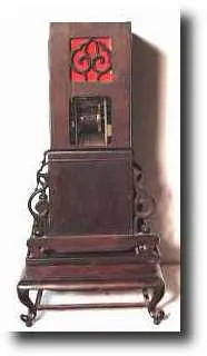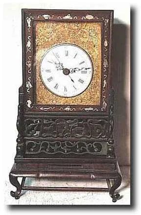 These clocks were originally given as wedding gifts to wealthy western and Chinese brides in China during the middle 1800's. The highly carved case and matching swivel stand are inlaid with mother-of-pearl. 19 inches high with a 4 inch porcelain dial. Engraving in a floral design surrounds the dial. A double fusee movement with a crown wheel escapement and a sweep second hand. Thick heavy plates on the movement; retains its original fussee chains on both sides. Comes with the original brass key.To simplify winding, this clock also has a swivel base - the entire piece turns around since it winds from the rear. Three pearl pieces are lacking on the door, but the rest of the case is complete - including the glass on the sides.Sold in unrestored condition without reserve