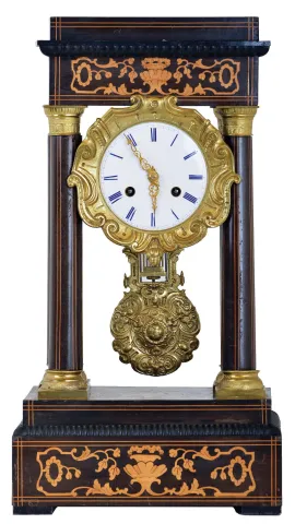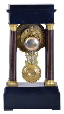 French, Empire style 4-column wooden cased portico clock of mahogany with contrasting satin wood inlay, and with grid pendulum with heavy cast brass bob, now polished.