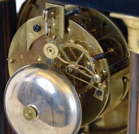 the movement was recently cleaned and polished and seems to be ticking and striking robustly. Delicate brass hands are original. Movement bears the br...