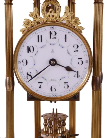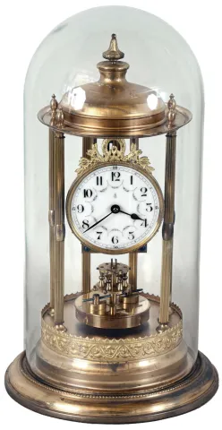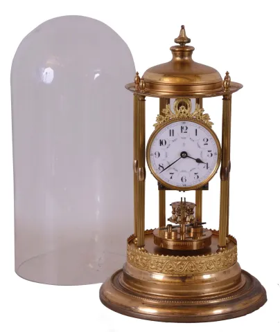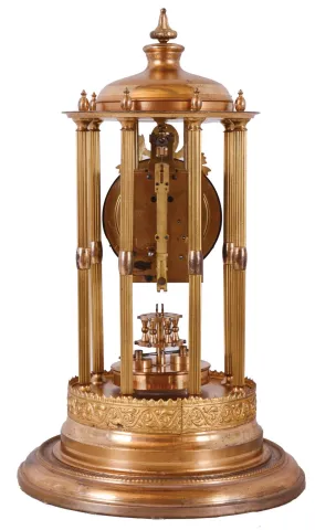 Gustav Becker, Germany Louvre style 400 day anniversary clock, spring driven torsion pendulum movement in a polished brass case under dome.
