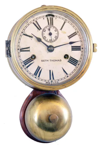 Seth Thomas Clock Co., Thomaston, Conn., 30 hour outside bell brass ship's bell striking marine wall clock,
