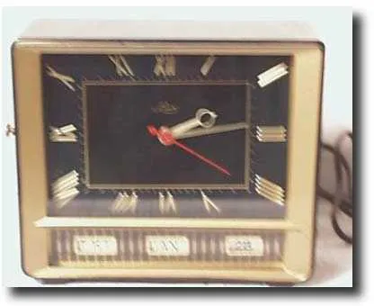 Lux Electric Calendar Clock, 2nd half 20th century with the month, date and day. calendar. It has both hour and minute hand, as well as, a red second hand. The unusual calendar components are below the black time dial, with its roman numerals. It is in working condition.