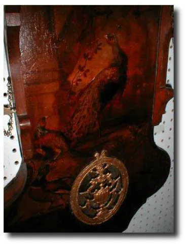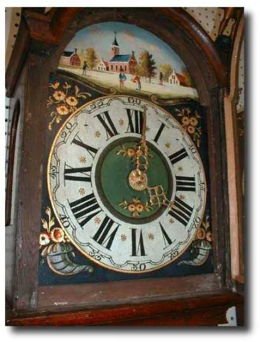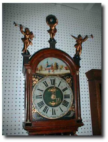 Dimensions:55" tall by 14" wide. Maker/Mfgr./Author/Artist:Unknown 19th Century Dutch clockmaker. Condition:Very good; runs well and strikes properly. Statues are later additions-as usual. Circa:1890 Materials:Painted wood case depicting Peacock and flock; brass movement; carved wood statues on hood. Description:Dutch STAARTKLOK or "tail clock", hand-painted scene on the front of the tail. The painting depicts a brood of peacocks. The clock dial has a quaint Dutch village scene (see our photograph) and a beautiful blue background with gold leaf ornamentaion and flowers.The statues on the top of the clock are carved-wood additions. The clock has an alarm mechanism which is detached.