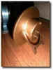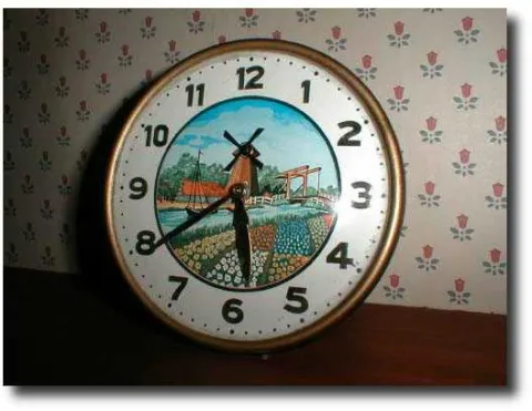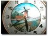 "Dutch" scene desk clock c. 1935 Dimensions:4 1/2" iun diameter and 5" tall. Maker/Mfgr./Author/Artist:Unknown-but it looks like a LUX? Condition:EXCELLENT, runs well and the windmill blades turn properly and continuosly, Circa:ca 1935 Materials:Brass case with brass movement, lithographed dial scene of Dutch windmill and tulip beds. Description:This animated desk clock features a Dutch scene with a continuously rotating windmill and colorful tulip beds beside a river in Holland. American-made (it looks a lot like one of the LUX line) and was probably made sometime in the 40's.