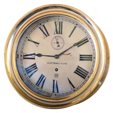 Seth Thomas Clock Co., Thomaston, Conn., brass hinged bezel 8 day time only engine room wall clock, 8 in dial also signed U.S. Gauge Co., NY