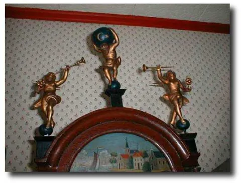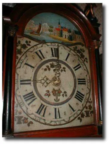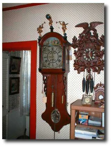 Dimensions:60 inches tall from bottom to top of center finial; by 14" wide at the hood. Maker/Mfgr./Author/Artist:Dutch clockmaker-unsigned. Condition:Excellent-runs and strikes properly. Circa:1875 Materials:Mahogany stained wood case; brass movement; painted iron dial. Description:Case in excellent condition. The image of Father Time on the lower pendulum bob window (see photographs) has a rooster on the top to remind us of the passage of time and our lives. The statues on the hood include Atlas standing in the center, holding the Universe on his shoulders and two Herald Angels on either side with their trumpets raised high. The weights and finials are exact but later replacements. The hand painted dial is 100 percent original and includes a charming Dutch village scene showing a quaint village, a church and a lake with a sailboat. The is an alarm mechanism in the movement, but has been disconnected. These clocks are wound by pulling the chain to raise the master weight...every 30 hours. In Holland is known as a STAARTKLOK.