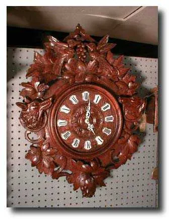 Dimensions:24" tall by 18" wide Maker/Mfgr./Author/Artist:Gustav Becker Clock Co., Schramburg, Germany Condition:Excellent Circa:1870 Materials:Wood carved case with rack and snail brass movement; pendulum operated eight-day works. Description:German wall clock was produced in the Black Forest of Germany by the Gustav Becker clock Co. around 1870. Carvings that depict two birds at the crown of the clock-sitting on either side of a bunch of grapes. Under the birds (in the middle of the case), is...on the left, a Fox lusting for a taste of the luscious fruit hanging overhead. On the right side of the case is a Hound eagerly eyeing the Fox. At the bottom of the case is another bunch of grapes. Carved in the inimitable style of the Old World German wood carvers, brass movement. The case was professionally refinished at some point in its history.