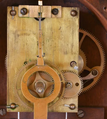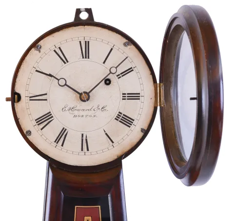 E. Howard & Co., Boston, Mass., "No. 5 Regulator", banjo clock, rosewood grained cherry case with reverse painted throat and box glass, signed Roman numeral white painted dial, 8 day timepiece movement, damascened pendulum with wooden rod, inside of case