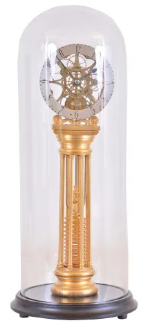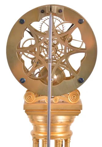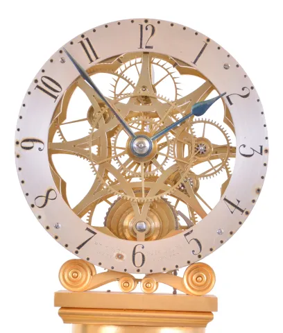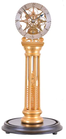 William Smith, Musselburgh, [Scotland] skeleton clock with helical mainspring, gilt, column form base supporting the skillfully pierced and finished 8 day fusee timepiece movement, and containing the mainspring, silvered dial marked "Wm. Smith Musselburgh