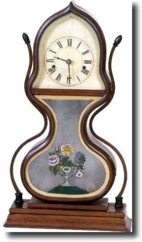 RARE J.C. BROWN ACORN SHELF CLOCK WITH SIDEARMS (Bristol, CT c. 1840s) Laminated rosewood case and sidearms. Old tablets and painted dial signed Forestville Mfg. Co., Bristol, CT, USA. Eight-day time-and-strike, brass, fusee movement. (See p.169 in Horology Americana for similar example.) Height: 24 1/2 inches, Width: 14 inches Provenance: ex Collection of Peter Zaharis, Ithaca, NY