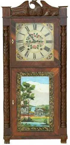 Wood works, double door, great carved columns, eagle, good dial, clean label, eight-day movement, Provenance: Estate of Harold Day, Wellsville, NY