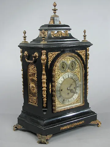 UNSIGNED EARLY ORNATE ENGLISH BRACKET CLOCK This outstanding unsigned English bracket clock features an ornamental gilt filigree dial with platinum colored metal dial with black letters. Above is a similar platinum colored dial with black letters for chime and silent and for Westminster Chimes or chime on eight bells. The fine black lacquered with much metal ornamentation of gilt ormolu work. The fine brass and gilt works are engraved on the inside lyre as well as the pendulum. SIZE: 30" to the top of the finial, wood is approx. 15" w and approx. 9 1/2" d. CONDITION: Generally very good. Complete with a pendulum and clock key the gold gilt metal is worn with much patina. The case is structurally very good with some minor rubs or scratches and other similar signs of use