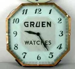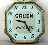 An octagonal shaped front on dial printed "Gruen Watches". SIZE: 15 1/2" diameter. CONDITION: Glass on dial cracked; a piece of molding metal around t...