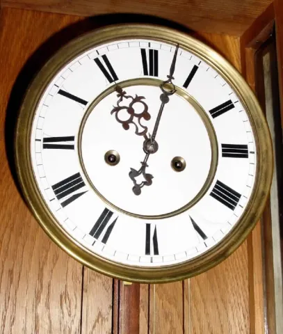 C.1900, Austrian, 2-Weight Regulator , as-found. This clock needs some attention. The oak case is missing both bottom return moldings; weights are damaged and do not match; dial with hairline at 4. Pulleys are new replacements. Still, it is ticking and striking and it will restore to a good looking clock. Height 42"