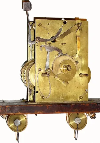 C.1810, American tall clock movement, seatboard and pulleys, needing some work.