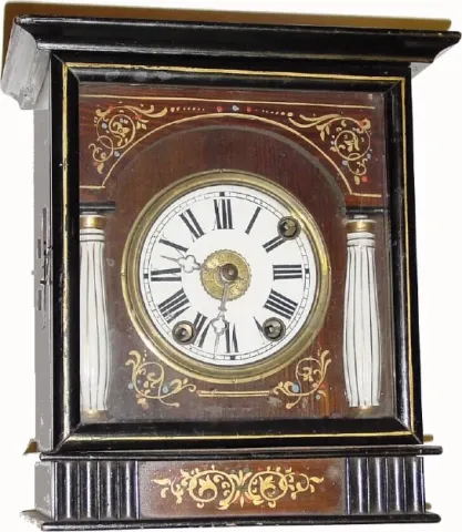 This cute little clock has most of its original stenciling intact. The glass dial and porcelain columns are perfect along with original hands. This is...