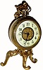 Clock winds with stem on top. Porcelain dial with gilt fancy metal center. Original hands. Stand has nice original gilt finish.