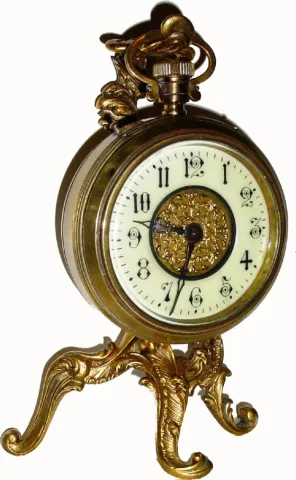C.1905, French, 8-day brass case "huge" watch with brass Rococo stand, in good original condition. Clock winds with stem on top. Porcelain dial with gilt fancy metal center. Original hands. Stand has nice original gilt finish.